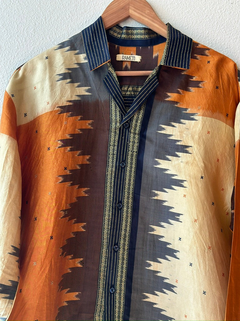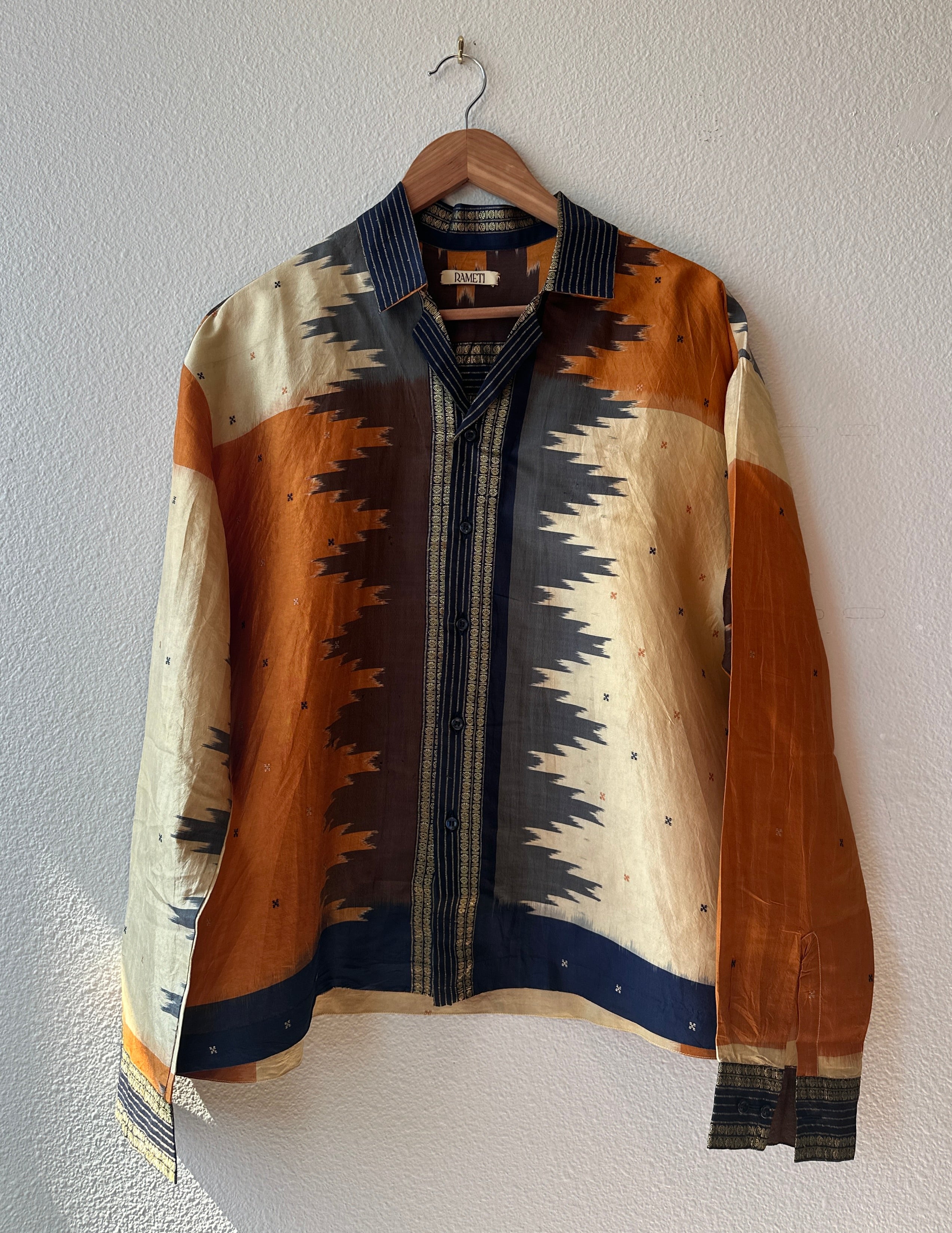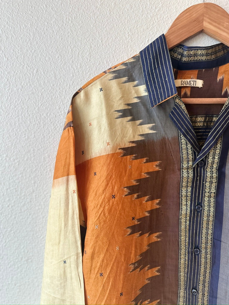 This unique handcrafted shirt is made from a vintage silk Ikat sari, featuring a sophisticated combination of cream with subtle Navy linear patterns and a striking green and navy Ikat collar.