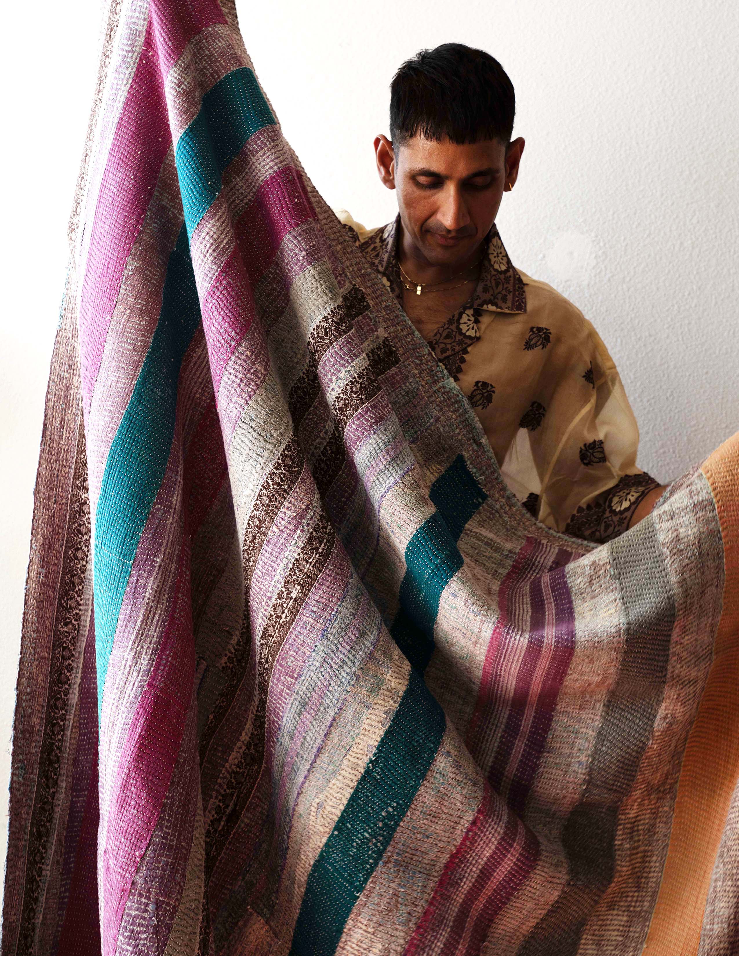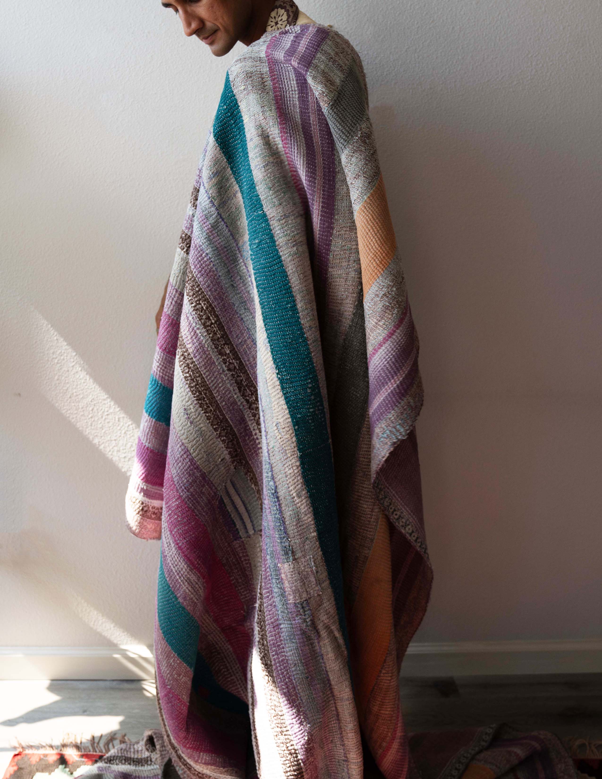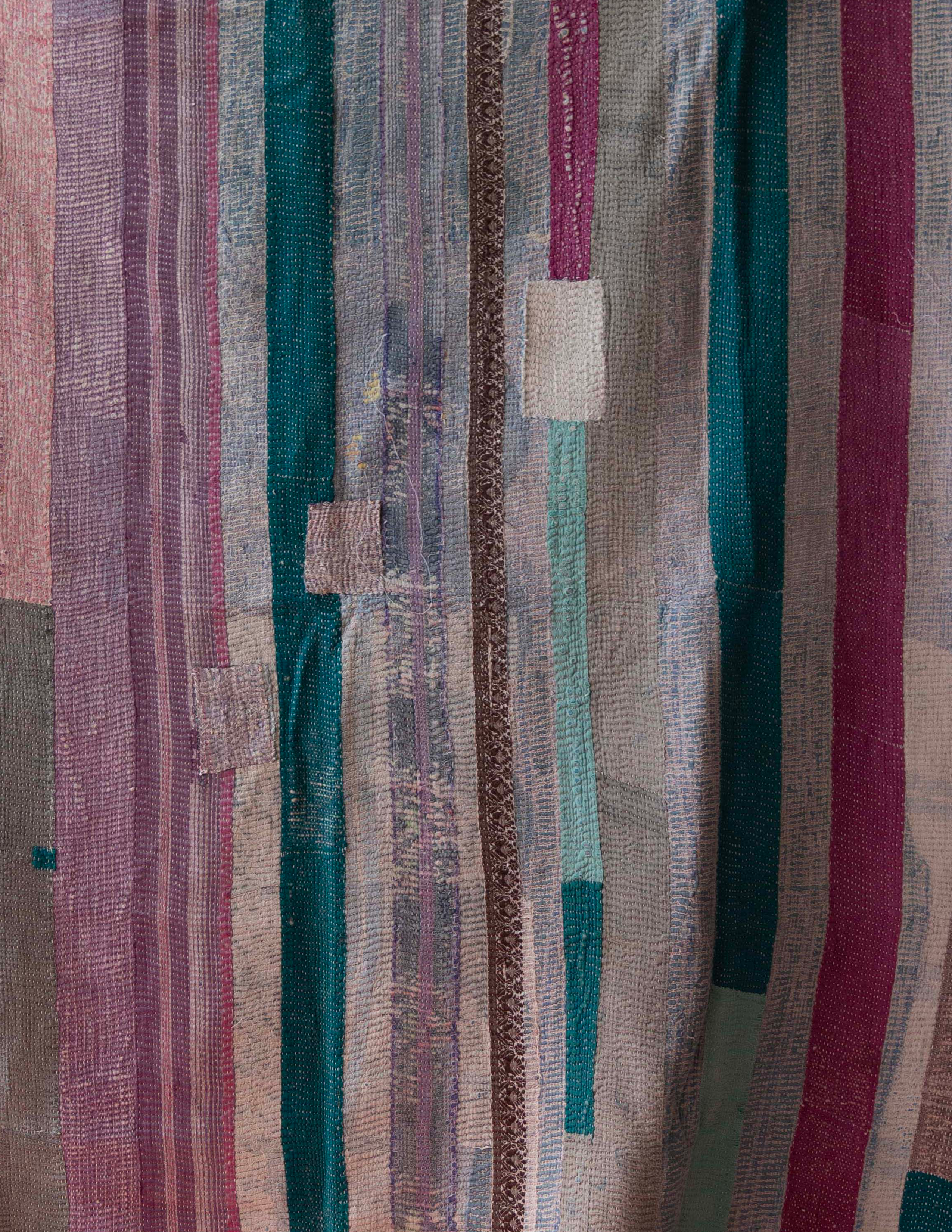 For centuries, Indian women have repurposed worn saris into exquisite quilts and floor coverings, blending beauty with functionality. At Rameti, we thoughtfully select each quilt—usually 60 to 80 years old—emphasizing their unique craftsmanship and striking appeal. Each piece is carefully dry cleaned before bringing it to our studio. Shanti kantha quilt have unique patterns on both sides