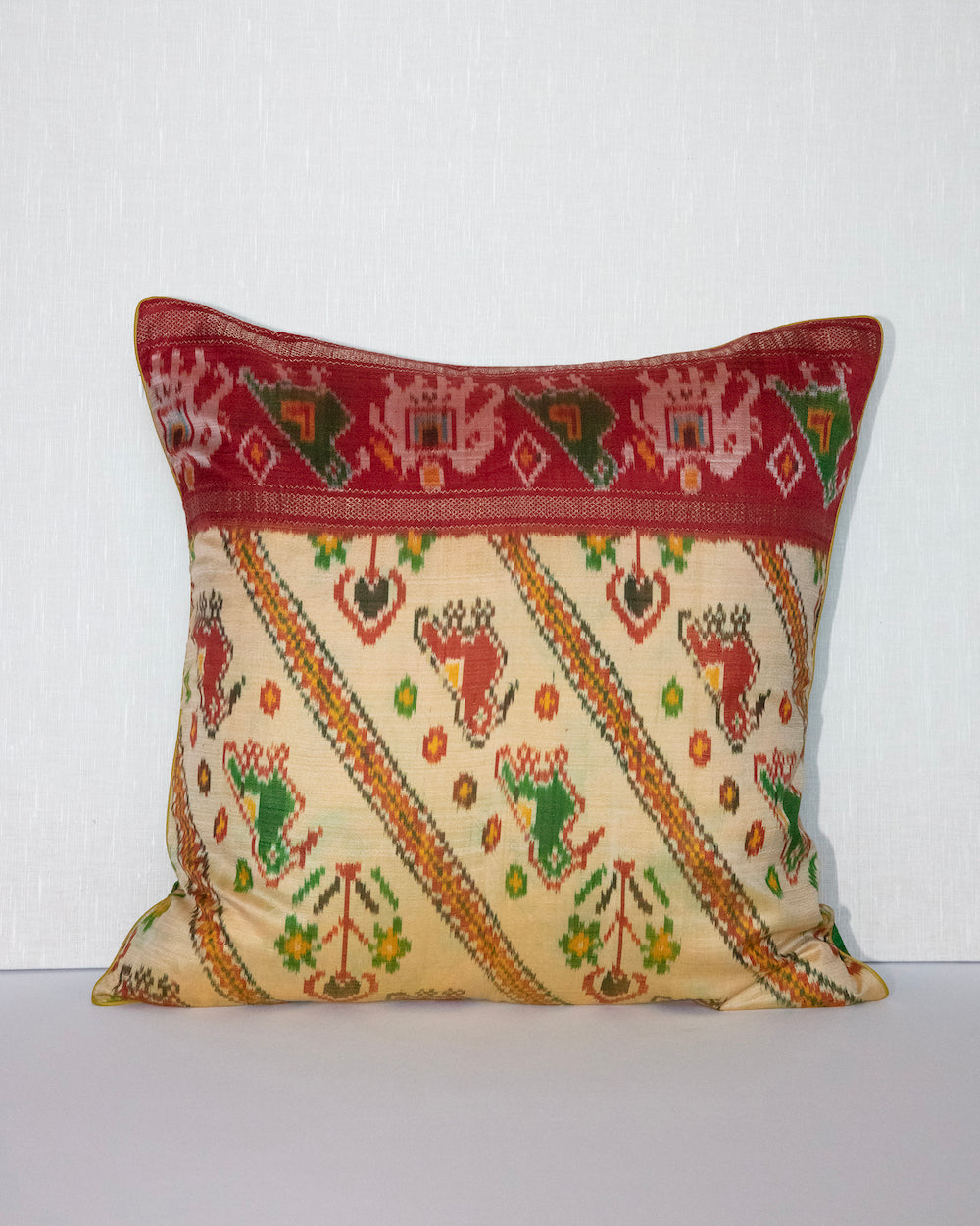 This one of kind pillow is crafted from a vintage silk sari. Each piece is uniquely handcrafted, making it a true one-of-a-kind item. The pillow features different front and back Ikat patterns, showcasing the intricate artistry of silk weaving. This rare pillow cover is perfect for adding a touch of elegance and global flair to your living room or bedroom. With only 4 in stock —ideal for those who appreciate the beauty of handmade, sustainable home decor.