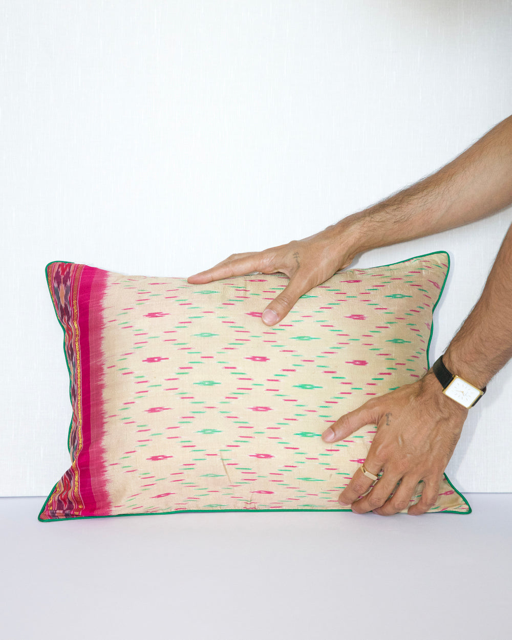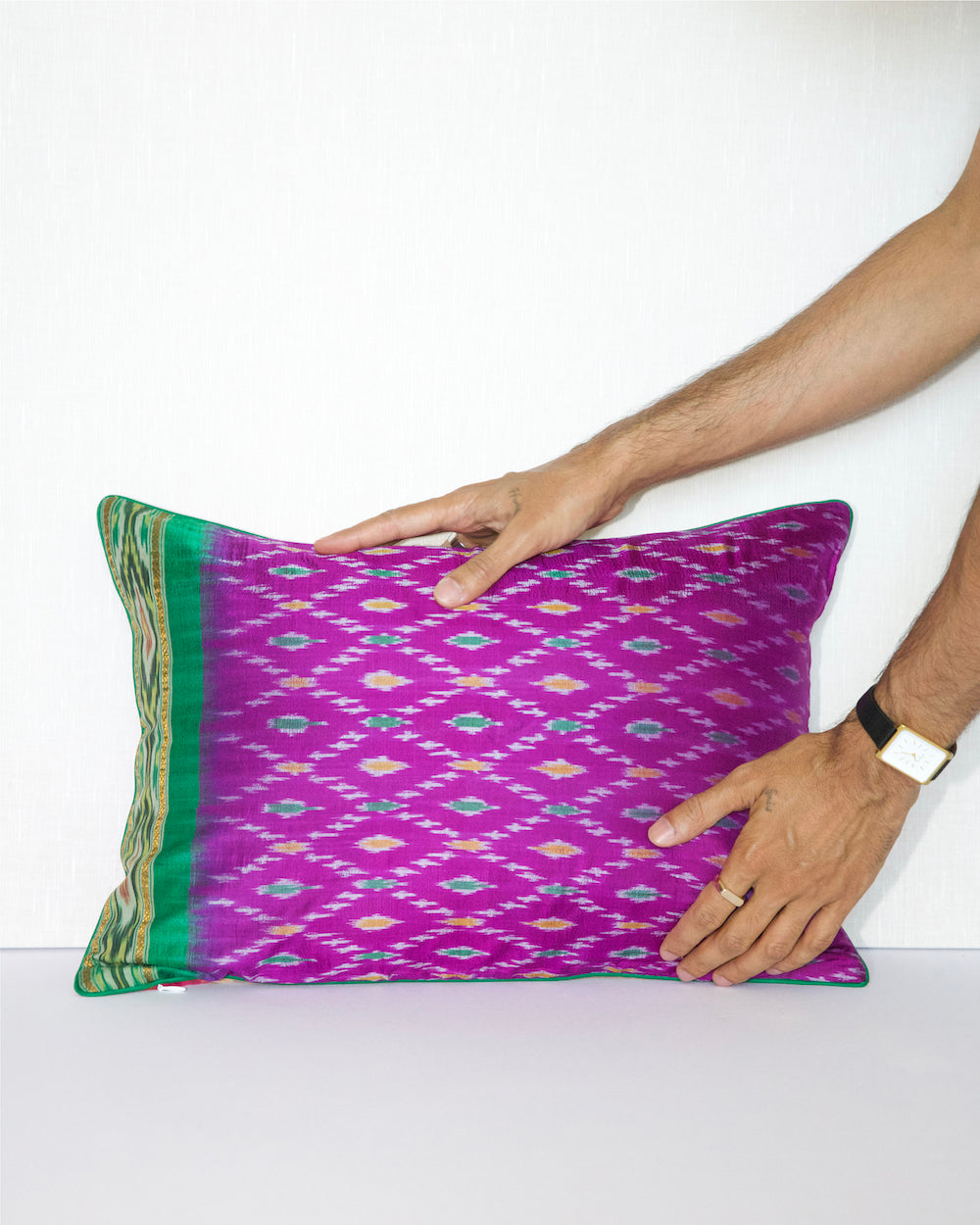 This one of kind pillow is crafted from a vintage silk sari. Each piece is uniquely handcrafted, making it a true one-of-a-kind item. The pillow features different front and back with traditional ikat geometric patterns, showcasing the intricate artistry of silk weaving. This rare pillow cover is perfect for adding a touch of elegance and global flair to your living room or bedroom. With only 4 in stock —ideal for those who appreciate the beauty of handmade, sustainable home decor.