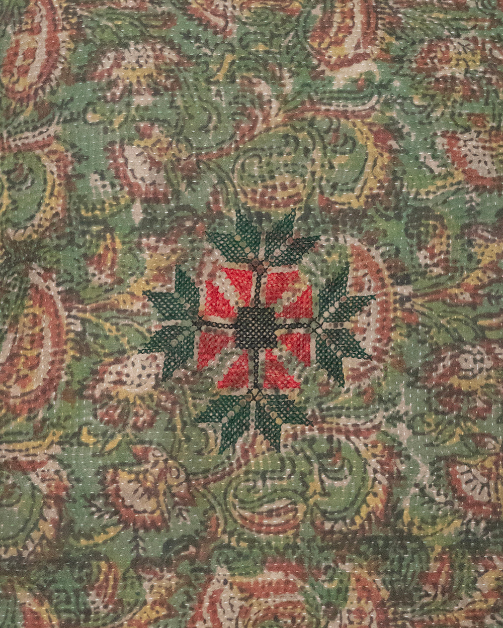 This one of kind pillow is crafted from a vintage kantha quilt, dating back to the 1940s-1950s, which were traditionally made by repurposing old saris into quilts using the intricate kantha embroidery stitch. To enhance its uniqueness, the quilt has been over-printed with a Kalamkari hand block print. We made only four pillow cover and you will get one of the four.