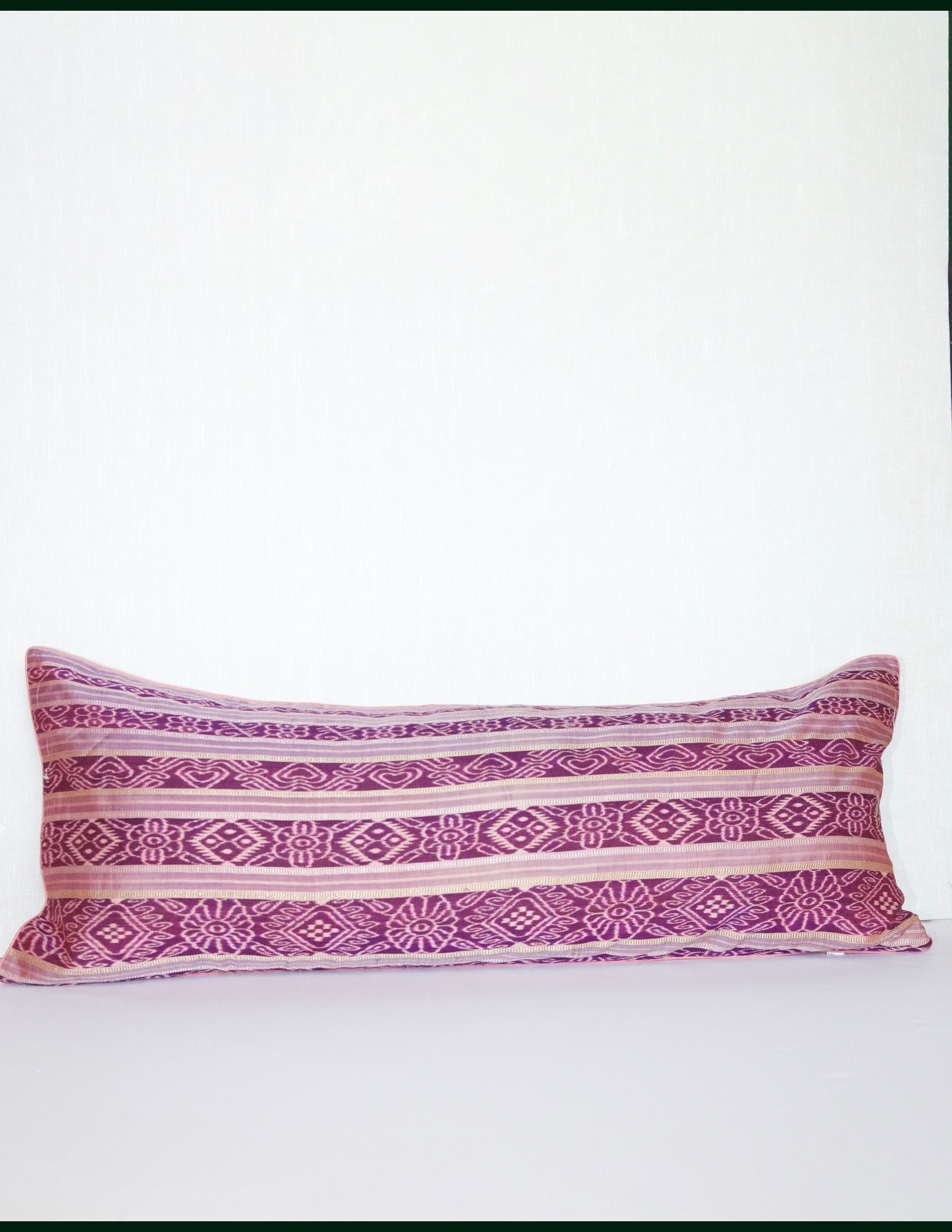 This one of kind pillow is crafted from a vintage silk Ikat sari handwoven by skilled artisans about in 1980s. The border of the sari was used to craft this unique pillow cover.