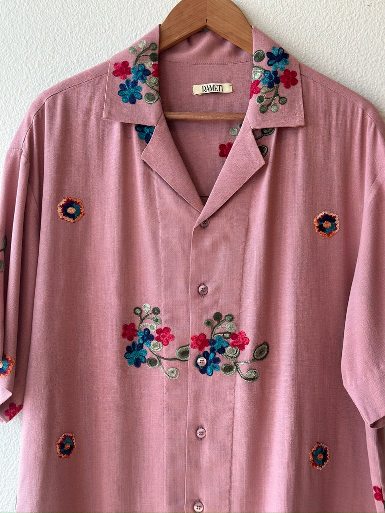 This unique handcrafted shirt is made from a vintage dead stock fabric, featuring an multicolor print. The luxurious fabric showcases the intricate weaving and craftsmanship of weavers.