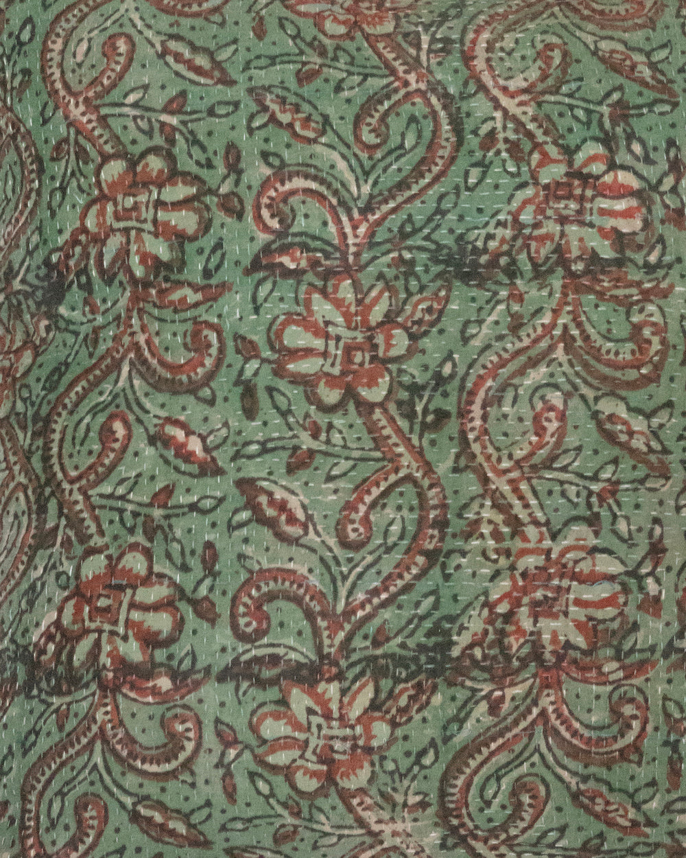 This one of kind pillow is crafted from a vintage kantha quilt, dating back to the 1940s-1950s, which were traditionally made by repurposing old saris into quilts using the intricate kantha embroidery stitch. To enhance its uniqueness, the quilt has been over-printed with a Kalamkari hand block print. We made only four pillow cover and you will get one of the four.