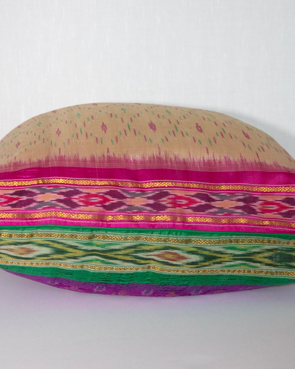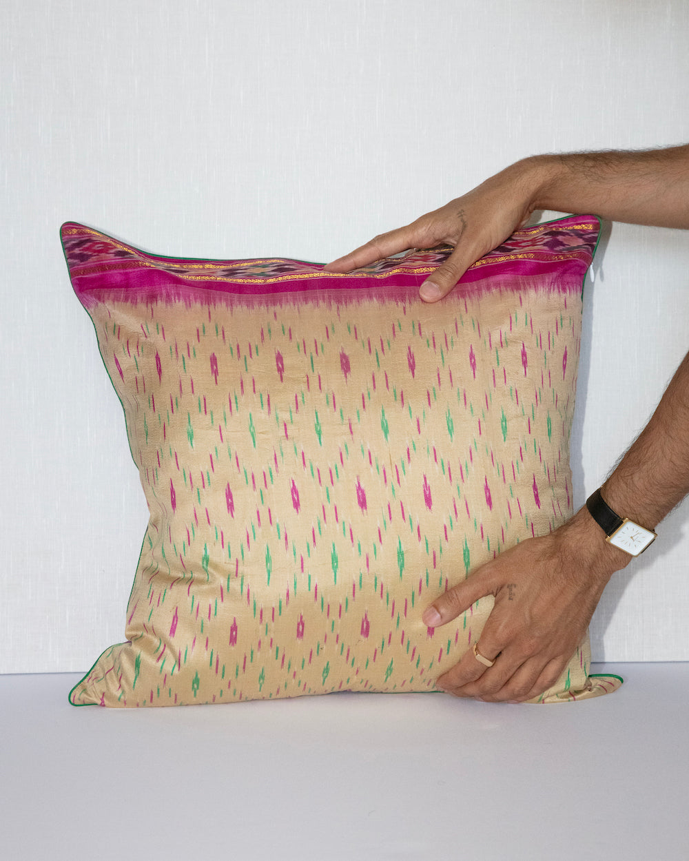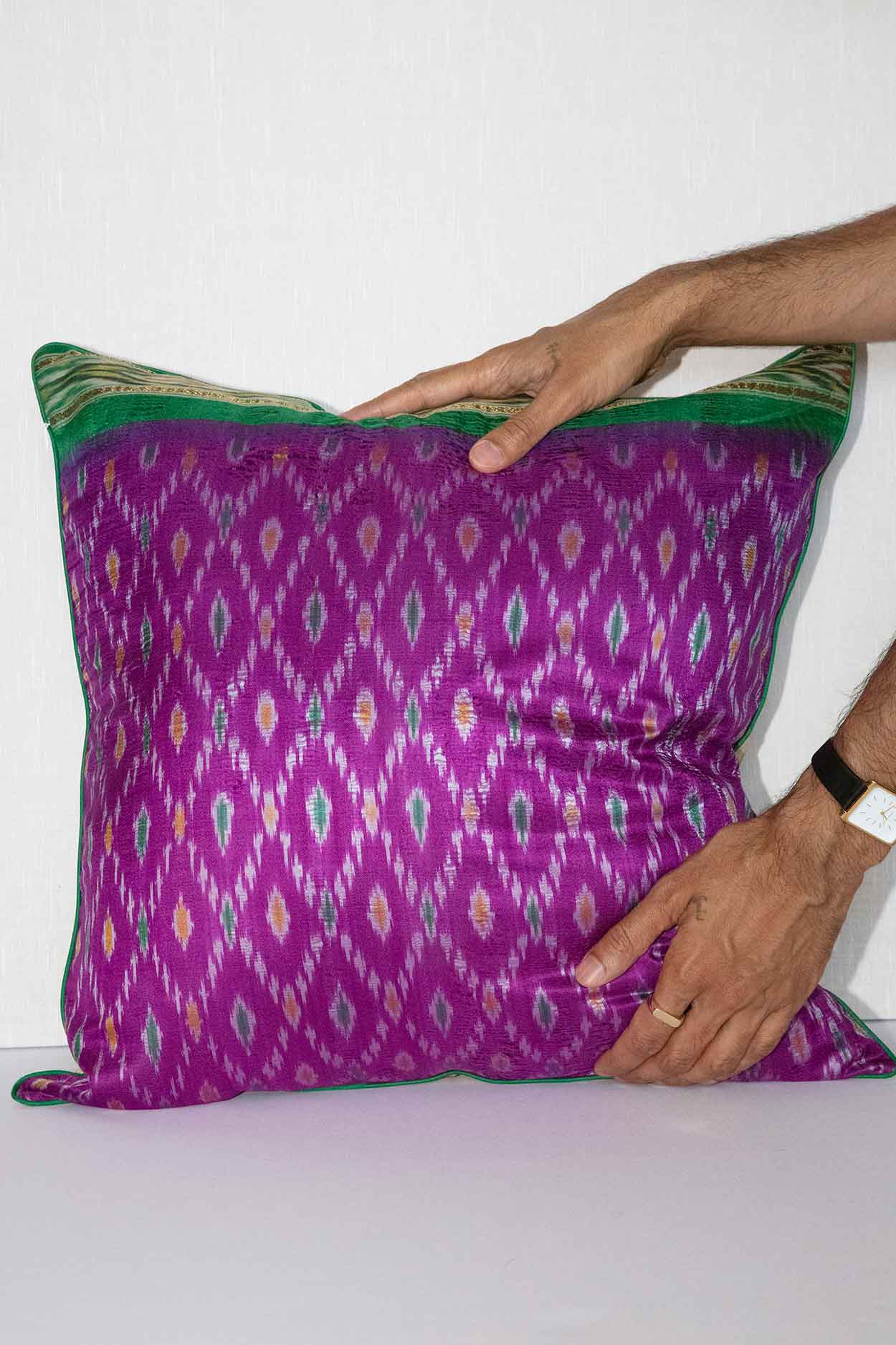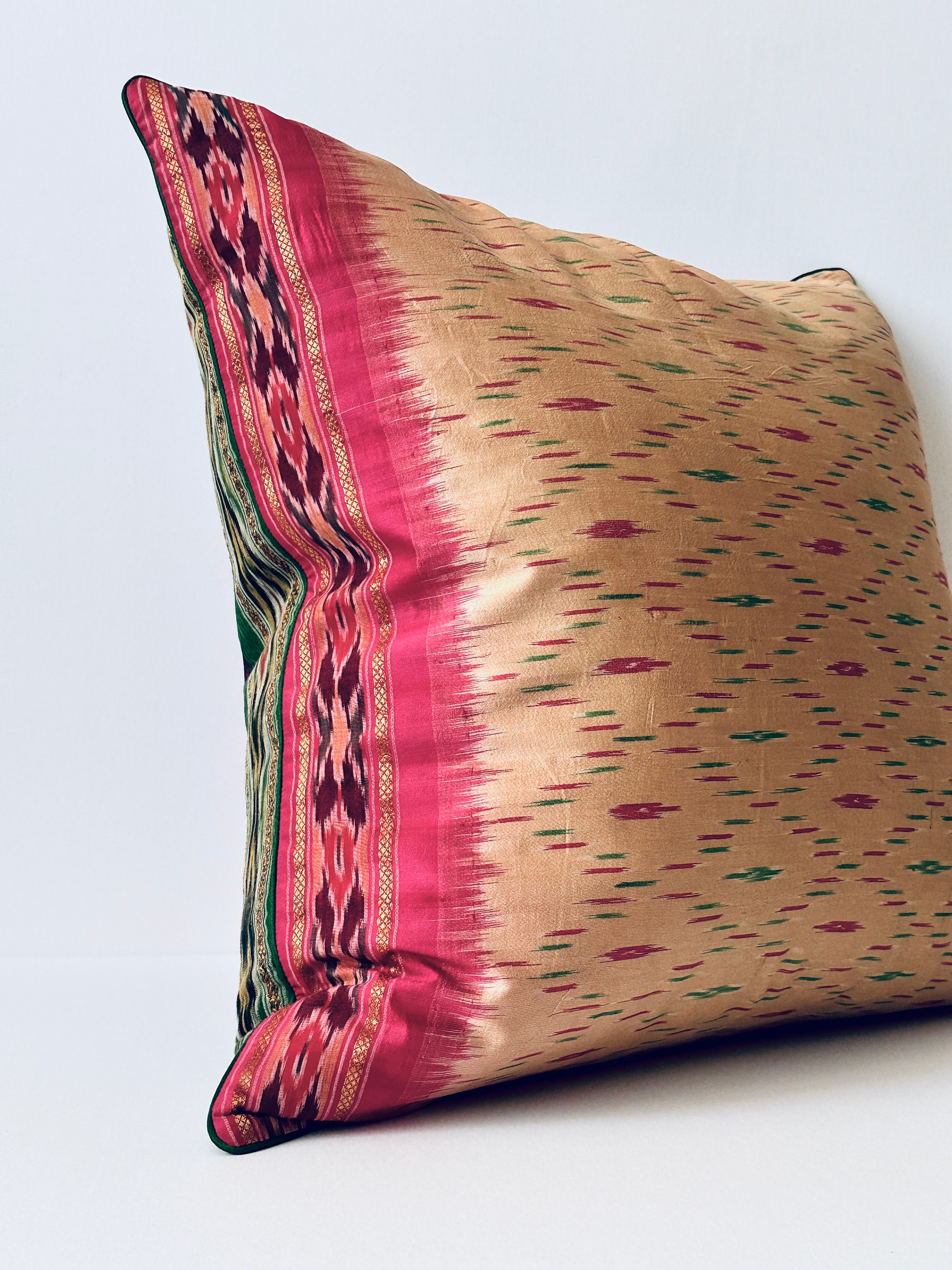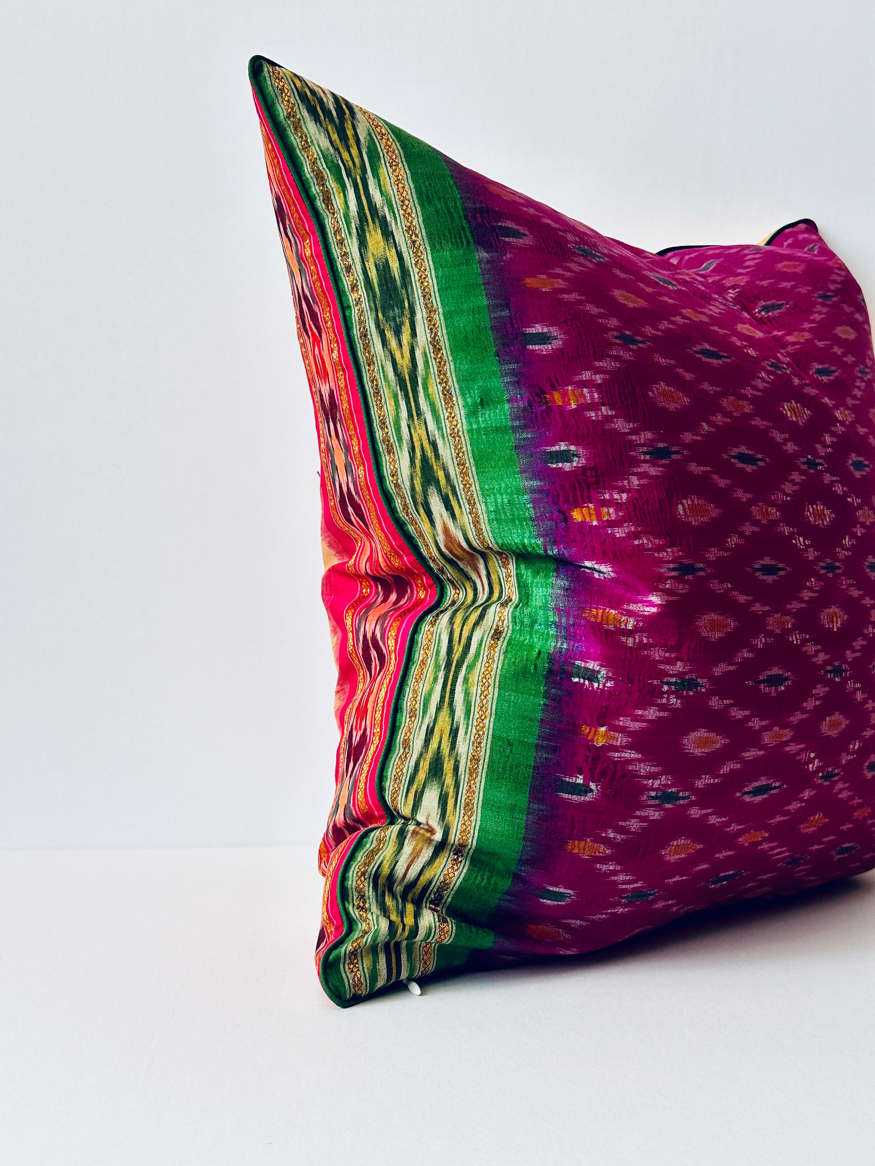This one of kind pillow is crafted from a vintage silk sari. Each piece is uniquely handcrafted, making it a true one-of-a-kind item. The pillow features different front and back with traditional ikat geometric patterns, showcasing the intricate artistry of silk weaving. This rare pillow cover is perfect for adding a touch of elegance and global flair to your living room or bedroom. With only 4 in stock —ideal for those who appreciate the beauty of handmade, sustainable home decor.